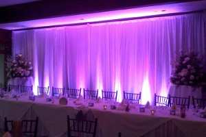 Time to hide the ugly wall behind the head table? Fear not, we can hide anything up to 14 foot high. Tie back entrances and up light the drape in any color you choose to take the room from boring to as elegant as you'd like.